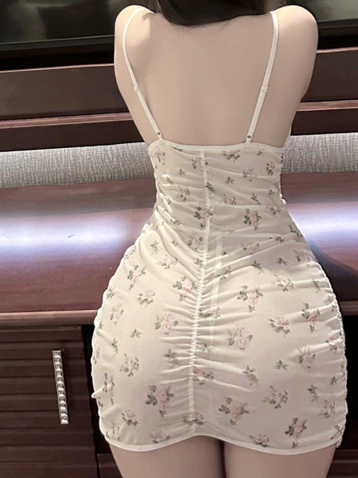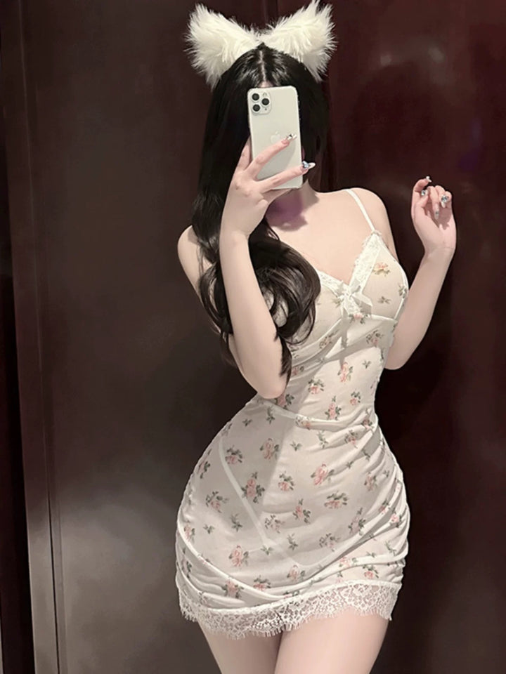 تصميم ناعم وراقي من الشيفون الخفيف المزخرف بنقشة الورود الوردية والبيضاء، مع لمسة من الدانتيل الأبيض على الصدر