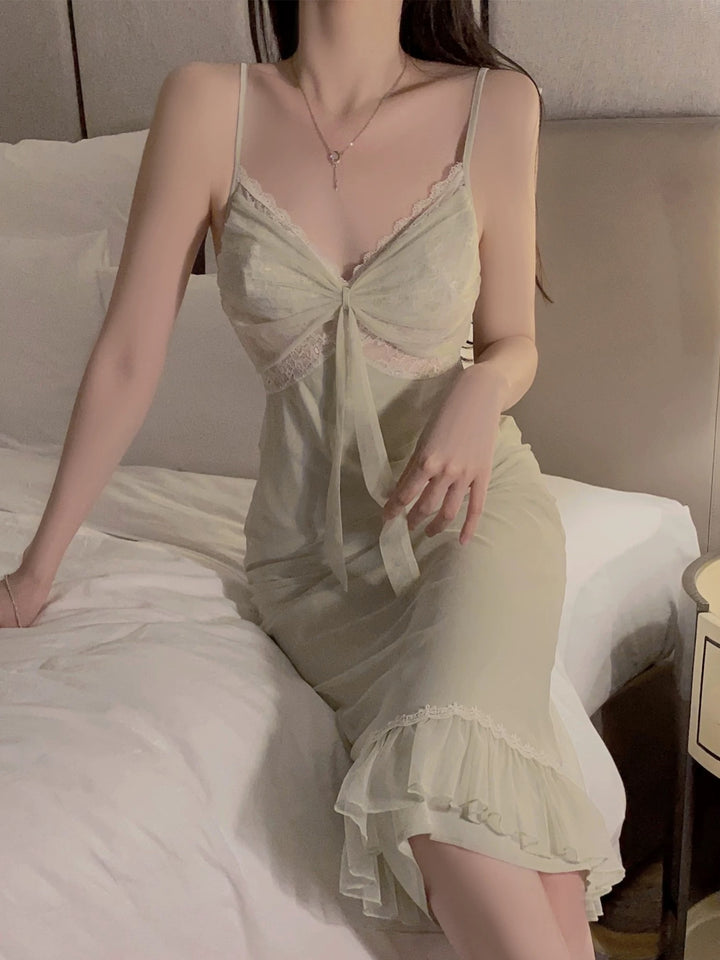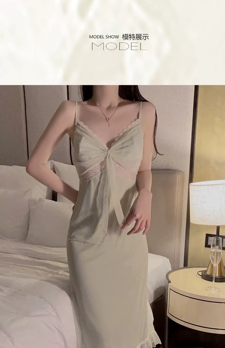 يتميز بتصميم بحمّالات رفيعة لمزيد من الأناقة، مع تطريز دانتيل شفاف عند الصدر والخصر يضيف لمسة جاذبية لا تقاوم.
