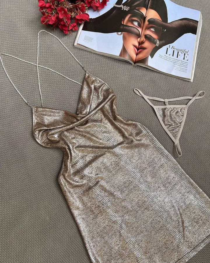 A shimmering metallic night dress designed to captivate. Featuring a feminine draped neckline and crystal-detailed spaghetti straps, this short silhouette flatters the body with an elegant, luxurious glow.