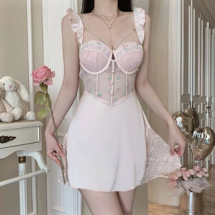 فستان نوم فاخر بتصميم ناعم وأنيق، يجمع بين قماش الساتان الحريري والتُل الشفاف المطرّز بزهور صغيرة تمنحه لمسة حالمة. تصميم الكورسيه يُبرز تفاصيل الجسم برقة، مع لمسات من الدانتيل الرقيق على الأكتاف والجانبين. قطعة مثالية لإطلالة رومانسية مفعمة بالأنوثة