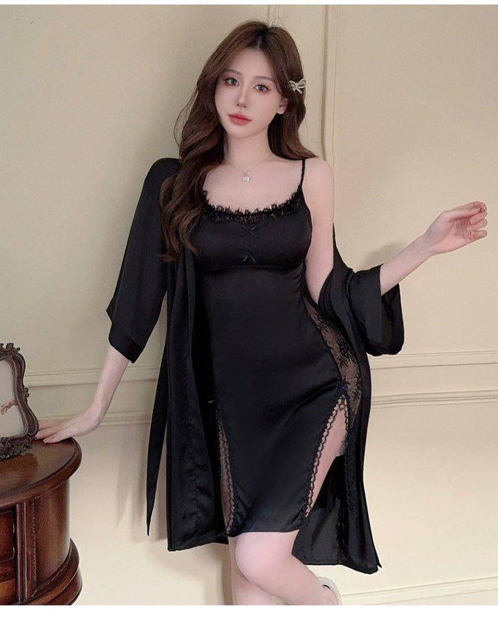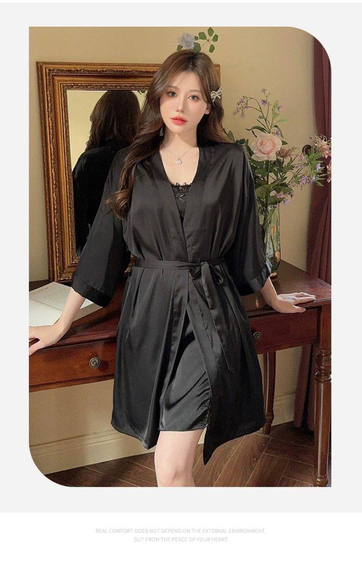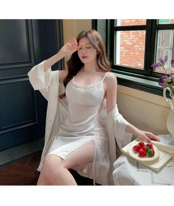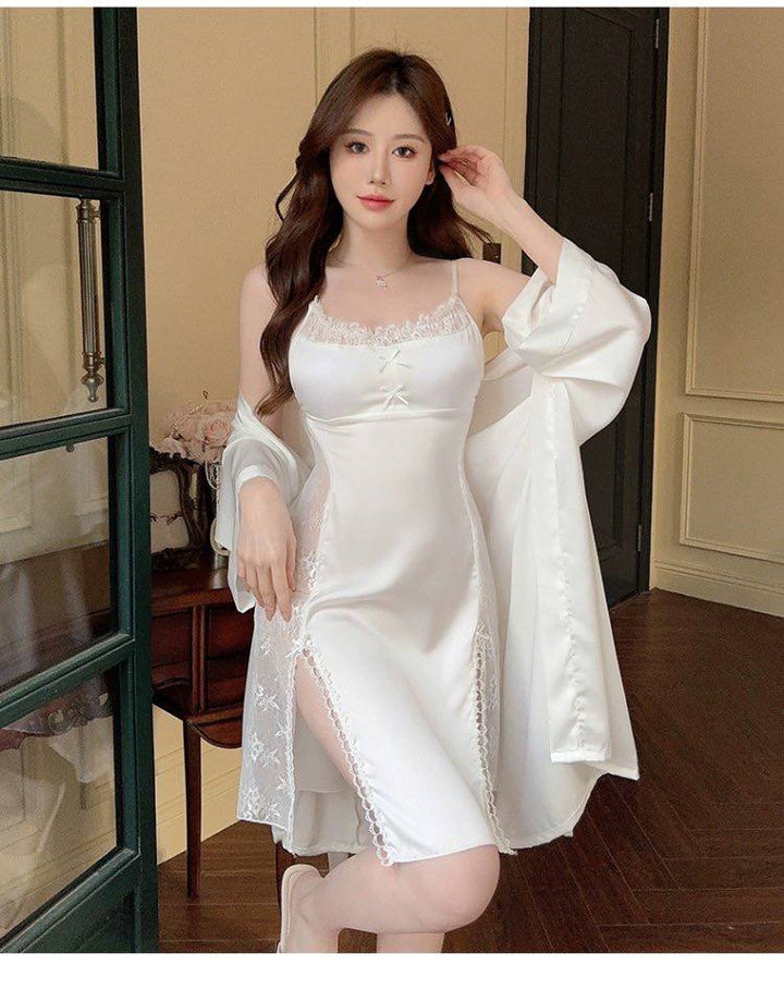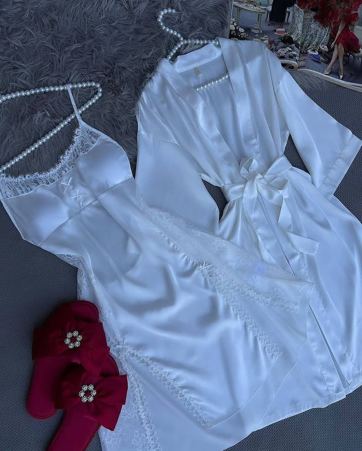 A refined and luxurious long satin night set crafted from ultra-soft fabric that glides smoothly on the skin. The gown features a graceful full length with delicate lace accents along the neckline and hem.