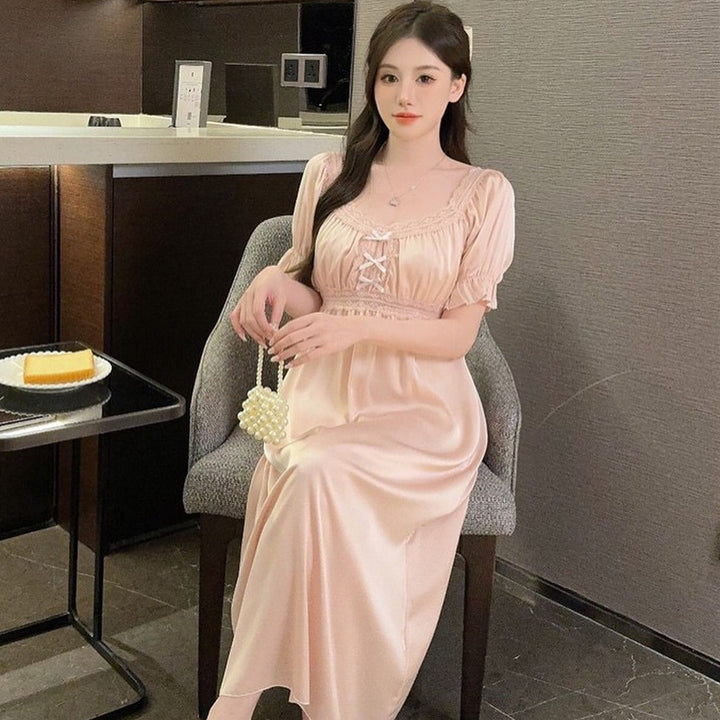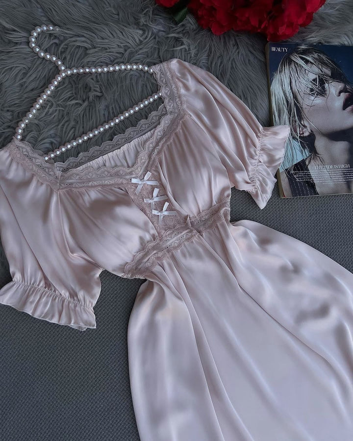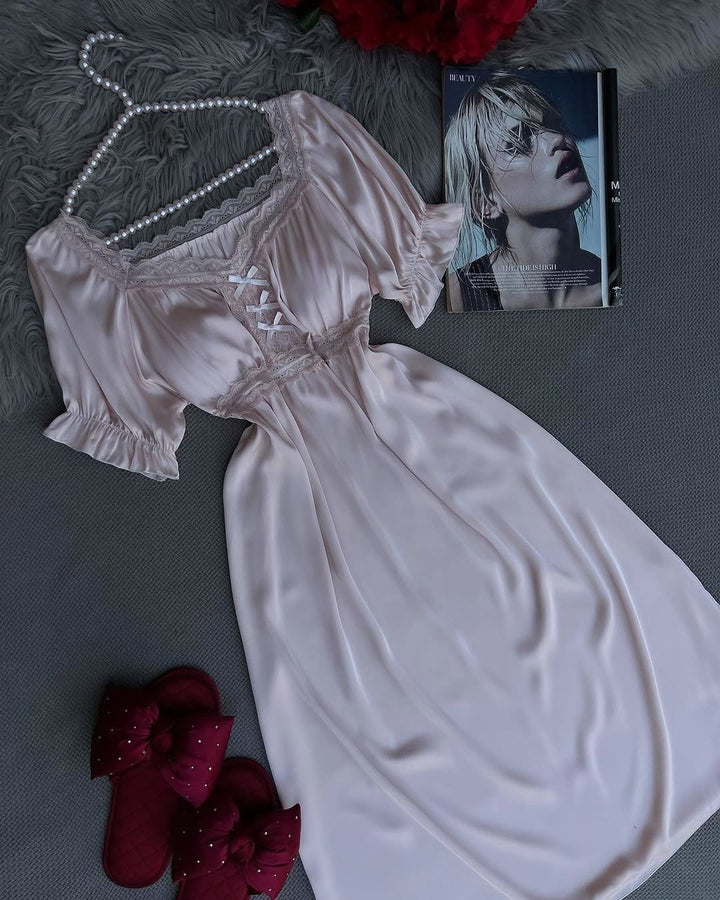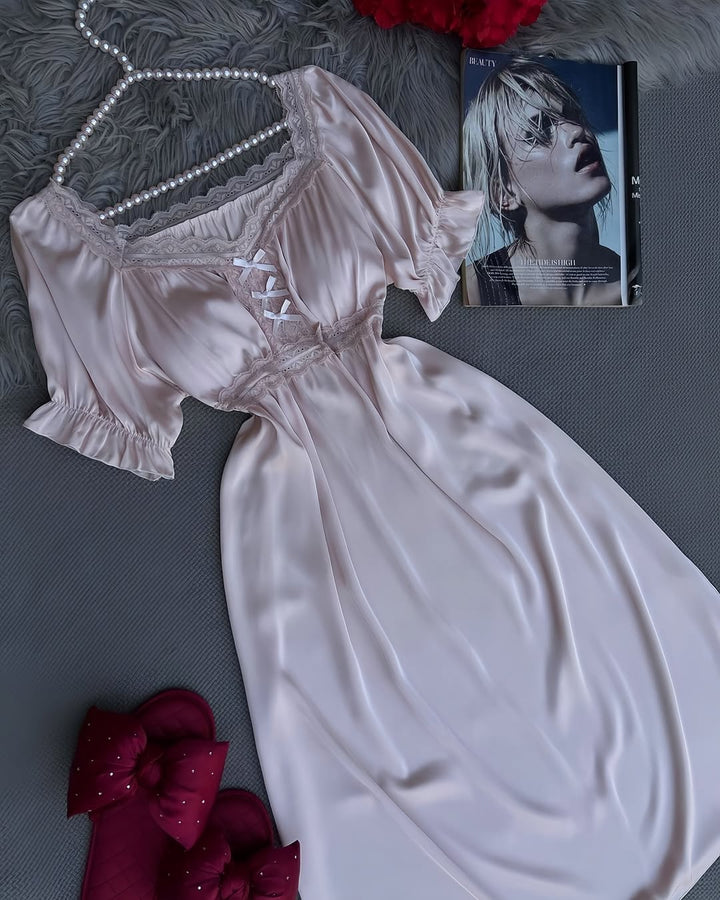 Elegant satin nightgown with delicate lace details on the chest and sleeves. The soft fabric and front ribbon design offer both beauty and comfort.