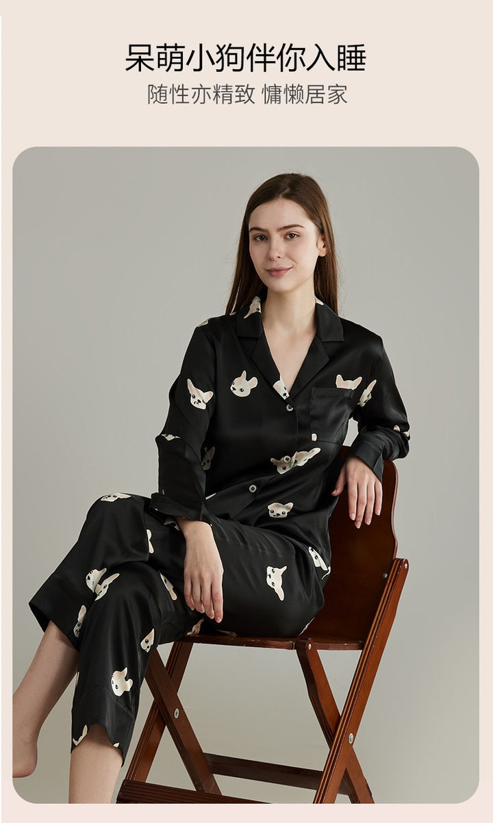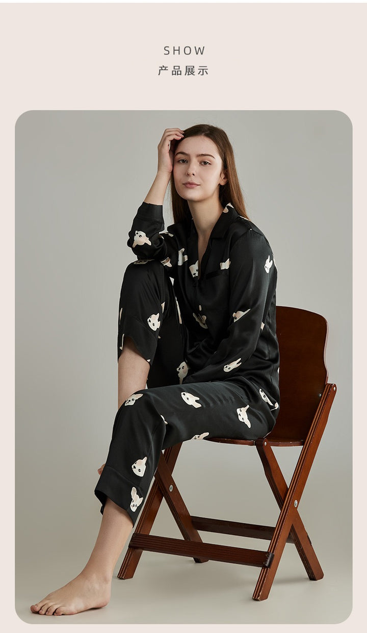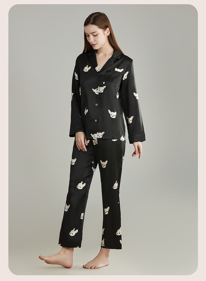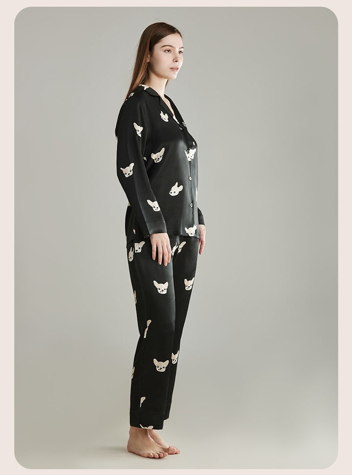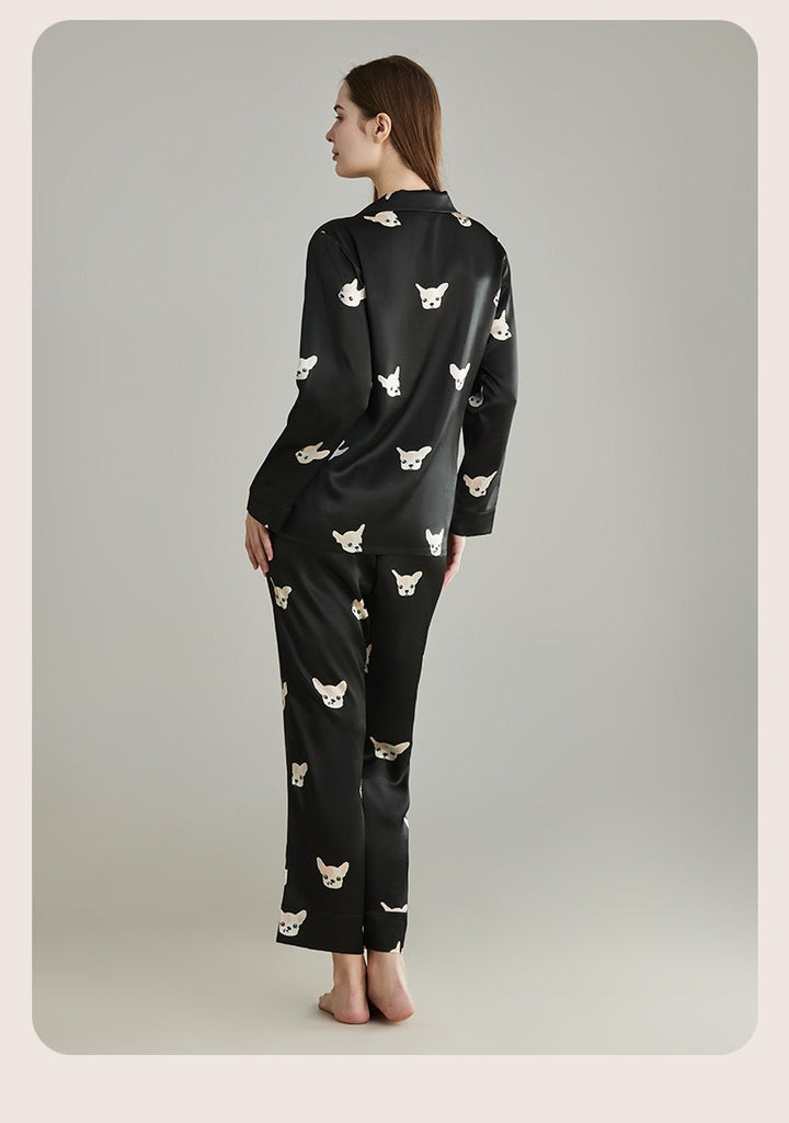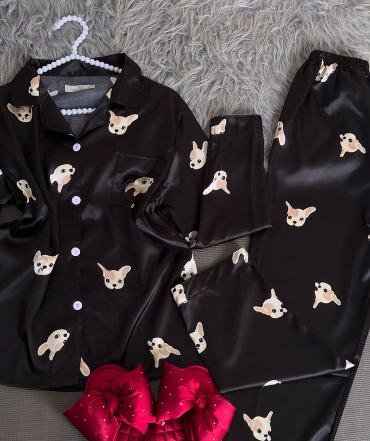 Chic and playful, this satin pajama set in deep black is adorned with charming puppy illustrations. Designed for comfort and personality, it features a classic button-up top and relaxed-fit pants - perfect for cozy nights with a touch of fun