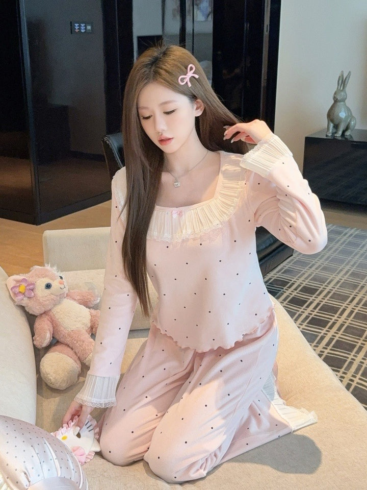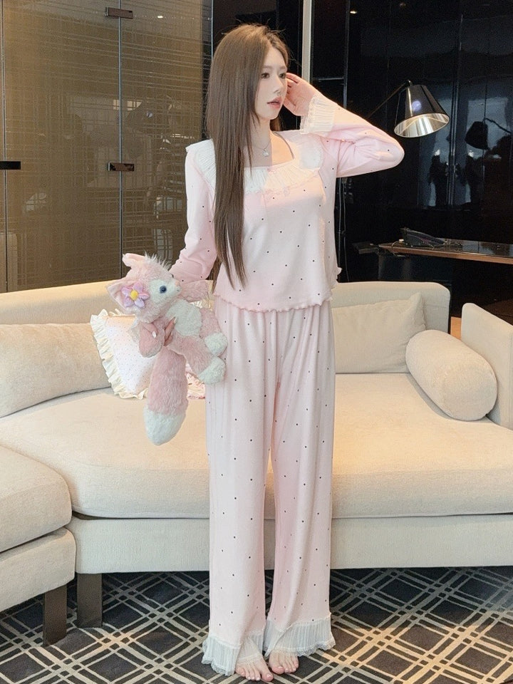 بجامة قطيفة ناعمة باللون الوردي الفاتح بنقش منقط وكشكشة أنيقة عند الرقبة