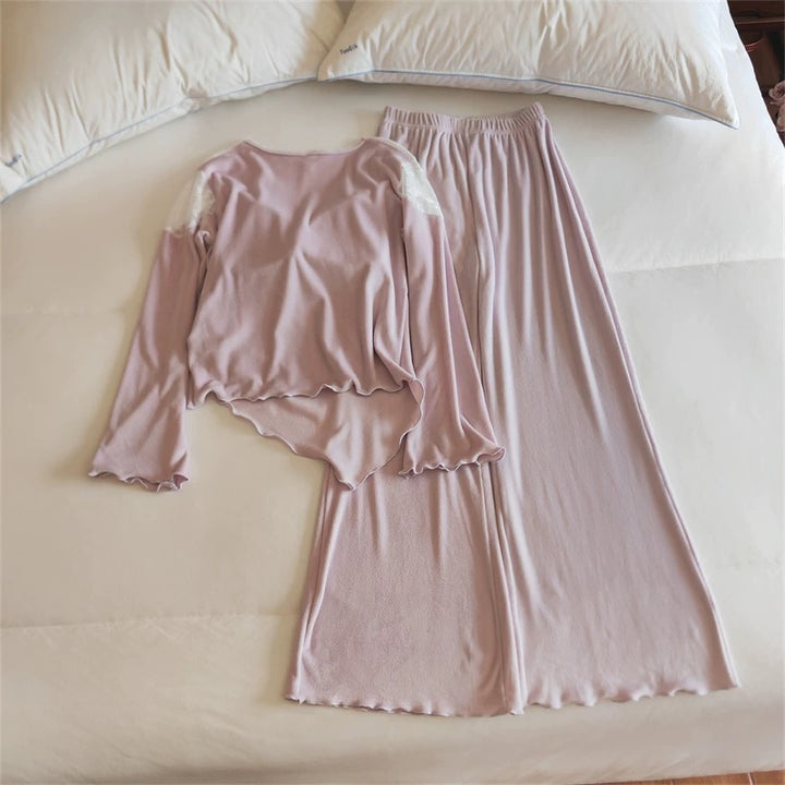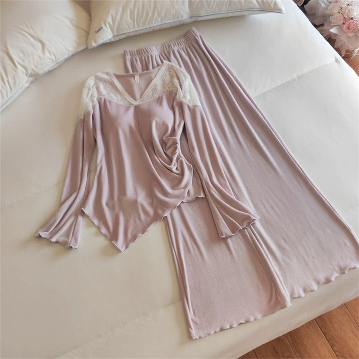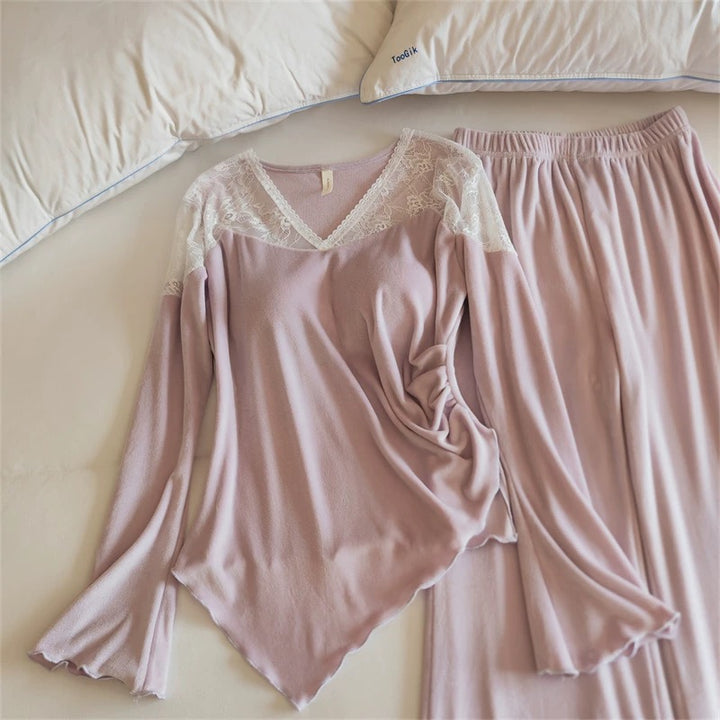 بيجامة قطيفة بتصميم منسدل بلمسة الدانتيل الفرنسي والأكمام الواسعة