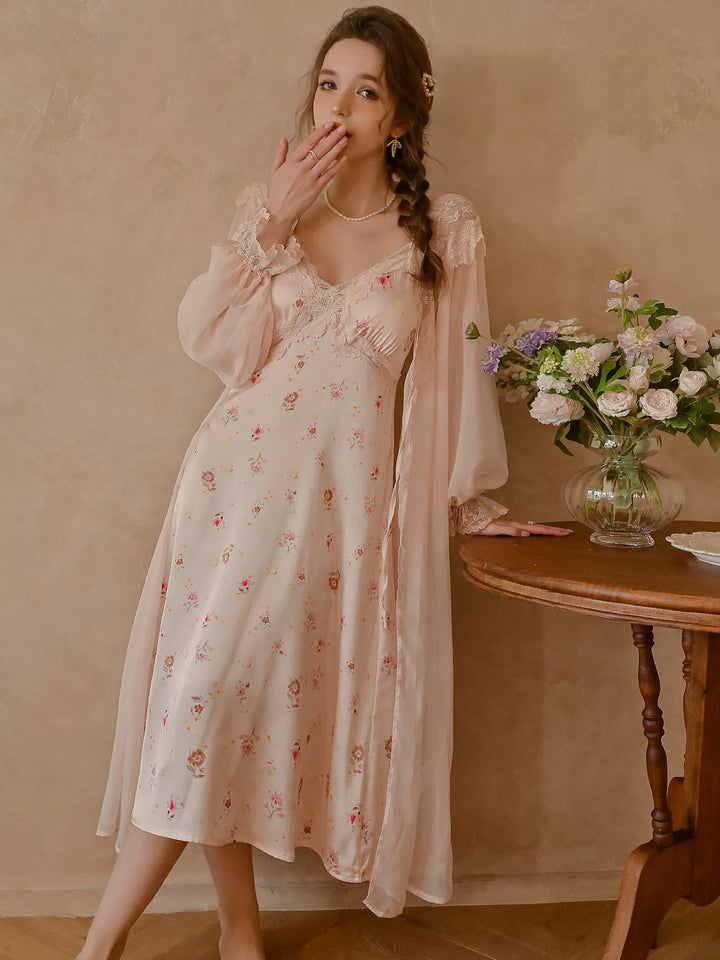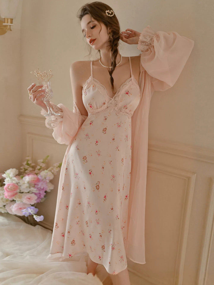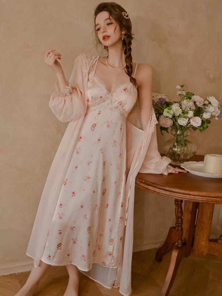 طقم نوم فاخر من الستان بطبعة ورد رقيقة – مع روب شفاف أنيق
